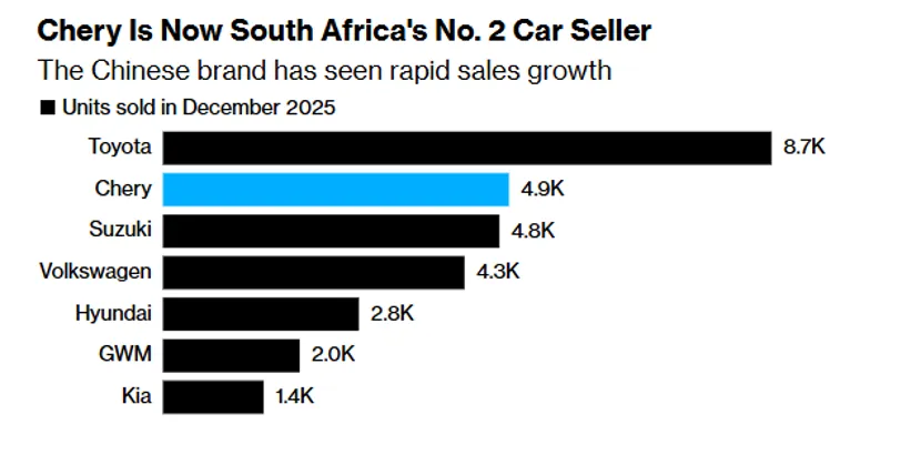 去年12月,仅重返南非市场四年后,奇瑞汽车就超越日本铃木汽车成为南非第二大乘用车销售商。去年10月,奇瑞南非子公司首席执行官托尼·刘在接受采访时称,由于根据非洲大陆自由贸易区(AfCFTA)协议,以南非为基地可以辐射整个非洲,因此南非的战略意义重大。他认为非洲人口规模与印度相当,且人口结构年轻,“未来几十年仍将是潜力最大的市场”。