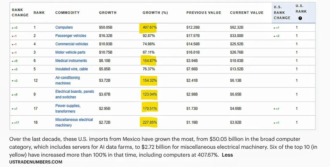在关税差异驱动下,墨西哥成为企业布局北美供应链的关键枢纽。尽管美国整体贸易逆差仍较2018年增长54.75%,但贸易流向已明显转向墨西哥、越南等地。其中,墨西哥在计算机与数据处理设备、电气机械等类别出口增长显著,过去十年美国自墨西哥进口的计算机类产品增长达407.67%,人工智能服务器等高端制造成为新增长点。