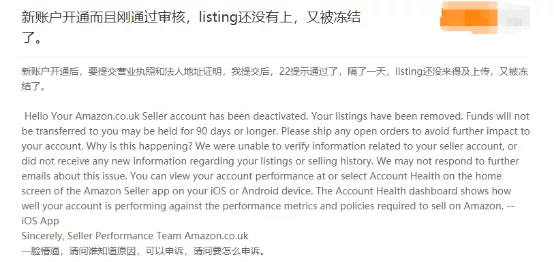 Prime Day刚落下帷幕,亚马逊卖家圈却不平静,姐夫又要开始出来搞事情了....... 今天一早小编看到很多欧洲站的卖家在说刚注册完账号,并且通过了KYC审核,但listing还没上,账号又被冻结了。 此次被封账号主要以新账号为主。 据论坛卖家反映,新账户开通后,要提交营业执照和法人地址证明,该卖家提交后,提示通过了,隔了一天,listing还没来得及上传,又被冻结了。 该帖下方很多卖家回复,都说账号被封,且不知道原因,甚至问了招商经理也没有答案。 (图片来自知无不言) 还有的卖家VAT都注册好了,账号还是被封了。 而这位卖家更惨,折腾一个多月,好不容易KYC审核通过了,但是没两天又被封... 具体是什么原因封号,亚马逊只是在邮件里说明了无法验证与卖家账户相关的信息,并且表示可能不会回复有关此问题的邮件。 目前,已有多位亚马逊卖家反映称,部分账号被集中二审,有的甚至还触发了三审,且申诉通过率极低。截止目前,日本站、欧洲站、美国站,甚至澳洲站卖家都遇到了此类情况。 小编在此提醒大家,亚马逊美国站和欧洲站点,近段时间新账号特别容易触发审核,如果申诉需要的资料无法提供完全,近期最好不要注册新账号。 旺季多灾多难,那么哪些账号容易成为平台的“猎杀对象”呢? 1、多账号操作的卖家,比如使用自己的小号跟卖大号等行为; 2、使用黑科技等手段卖家,且刷自发货卖家居多; 3、自注册小号卖家,未通过招商经理渠道全球注册; 4、产品和详情描述不符,导致众多买家退款、投诉存在刷单嫌疑; 5、知识产权问题,侵犯版权、商标和专利等。 6、违规平台政策,未经亚马逊允许销售限制类产品,违反卖家行为准则、操纵评论和反馈等; 突遭二审情况怎么办?又该如何维护账号安全? 1、遭遇二审时,务必按照正常程序,提供相关资料。 一般情况下,亚马逊二审较为常见的则是要求卖家提供水电账单、信用卡,以及法人地址证明,卖家提交齐全相应材料二审便能很快通过。(尤其是水电费账单的提交,必须是公共事业单位提供的盖章单子,而如果是发票字样的抬头文件将无法被予以通过。) 2、卖家如果是因更换信用卡或信用卡到期,导致扣款失败触发二审。此类情况下,可先提前联系亚马逊seller performance团队,告知对方要更改信用卡,让其帮助更改相关信息。 除此之外,也可与seller performance团队进行报备,说明自己需要更改信息,态度诚恳告知不要随意封账号。 ·end· —扫码关注我们— 福克斯德,不让亚马逊卖家孤寂地成长!
