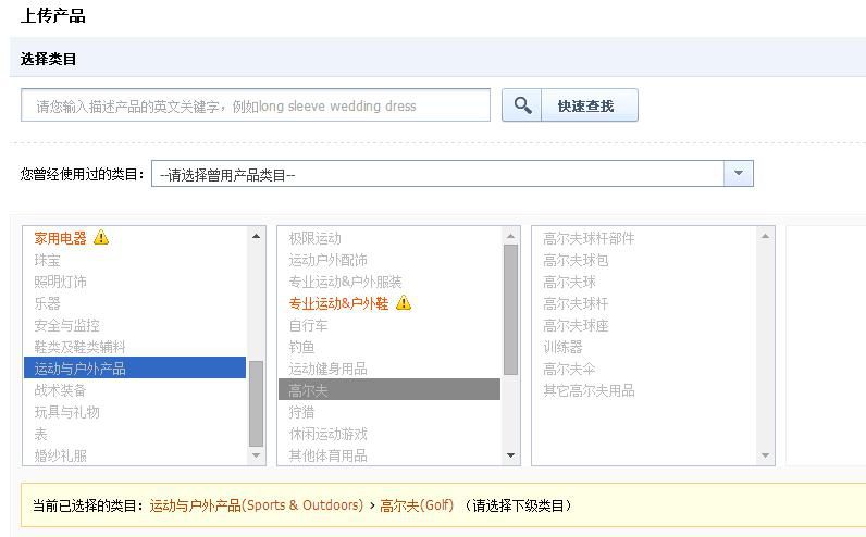 高尔夫是运动户外行业潜力产品线,目前主要招募的产品有球(单、双、三层)、球杆(木、铁、推 杆)、球包(球具包、托运包、手提旅行袋)球帽(帽檐大防止紫外线)手套(牛皮、羊皮)球服(衣服裤子)腰带、杆头套、小配件(雨伞、雨衣、毛巾、球插痕、球标、铅笔、杆数卡、球替)、高尔夫球鞋等。高尔夫上传类目如下: