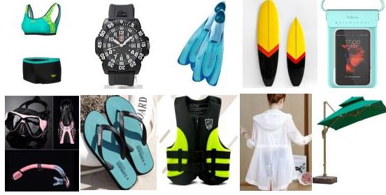 水上运动招募的产品包括但不仅限于:泳镜、泳衣、泳帽、耳塞、鼻塞、潜水手表、装东西的防水盒、防水袋、救生衣、呼吸器、脚蹼、浮力器、拖鞋、沙滩鞋、防晒霜、防晒服、遮阳伞、冲浪板、尾波板、沙滩玩具、捕鱼器等。