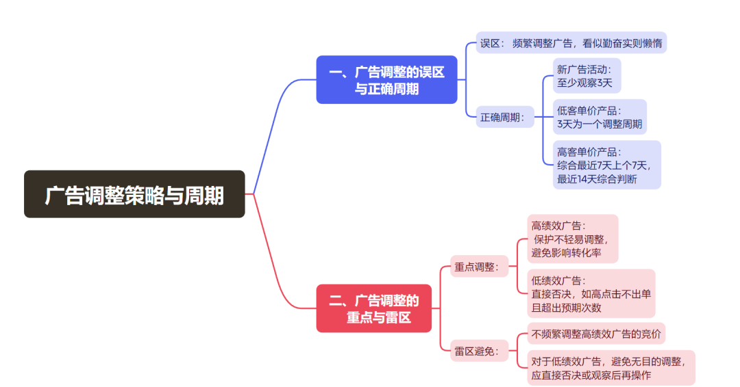 应该按照新广告和低客单广告3天微调; 所有广告7天下载报告调整; 高客单单广告调整的时候要结合最近7天、上个7天、最近14天综合对比调整。