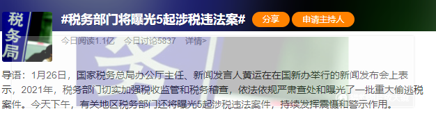 1月26日,国新办举行新闻发布会,国家税务总局办公厅主任、新闻发言人黄运介绍,2021年,税务部门切实加强税收监管和税务稽查,依法依规严肃查处和曝光了一批重大偷逃税案件。今天下午,有关地区税务部门还将曝光5起涉税违法案件,持续发挥震慑和警示作用。