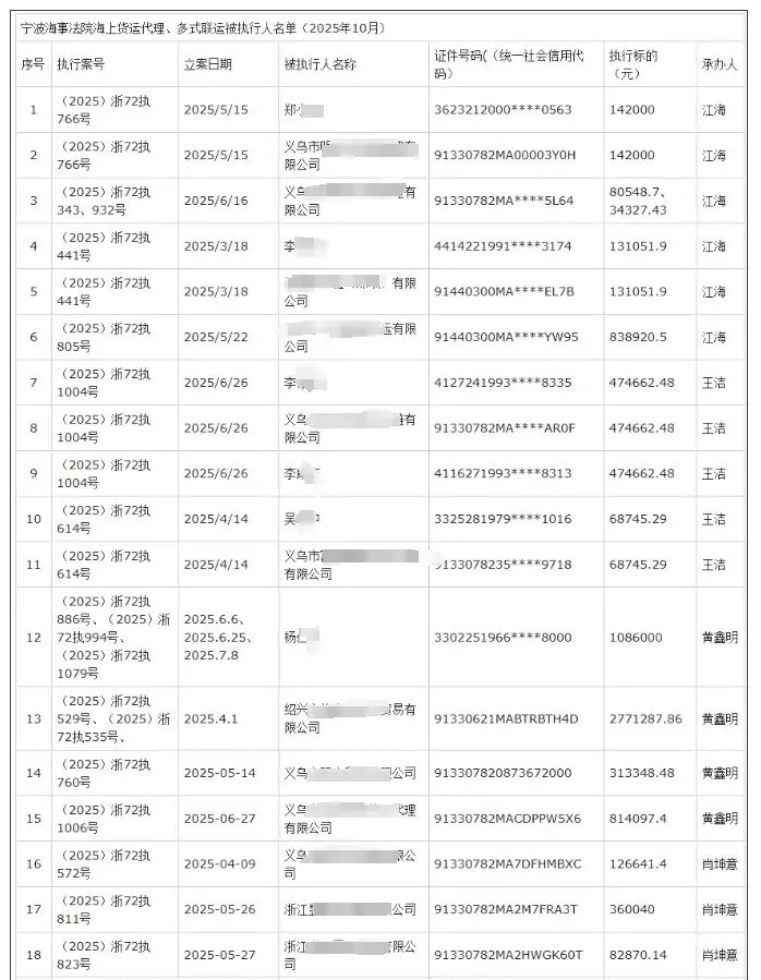 宁波海事法院在 2025 年上半年两次集中发布被执行人名单,34 家货代企业因拒不履行还款义务被列入黑名单,涉及金额从几十万元到上千万元不等。