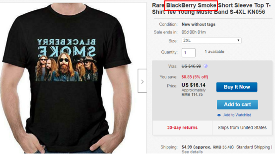 在其注册商标中,卖家朋友最常在产品上及产品描述中使用“BLACKBERRY SMOKE”一词,如下图所示: