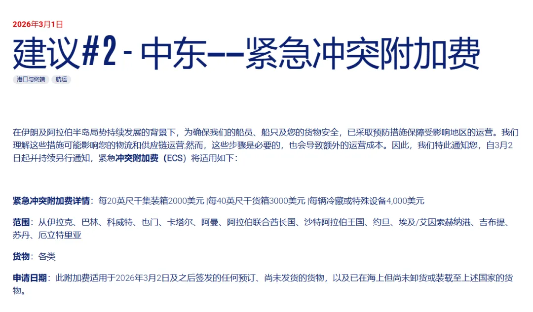 成本压力迅速传导至货主端。各大船公司掀起附加费上调潮。达飞轮船宣布收取紧急冲突附加费(ECS),覆盖伊拉克、阿联酋、沙特等十余国,标准为20尺柜2000美元、40尺柜3000美元,冷藏箱高达4000美元,自3月2日起生效。