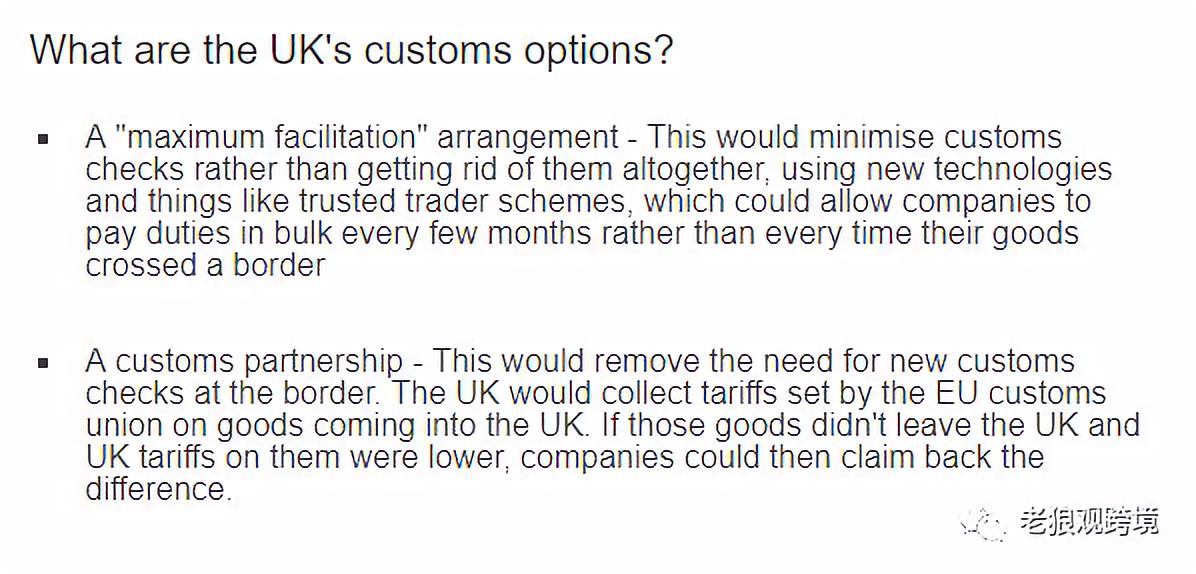 “海关合作”方案 - 这将消除在边境进行新的海关检查的需要。英国将收集欧盟海关联盟对进入英国的货物设定的关税。如果这些商品没有离开英国和英国的关税较低,那么公司就可以声称差异