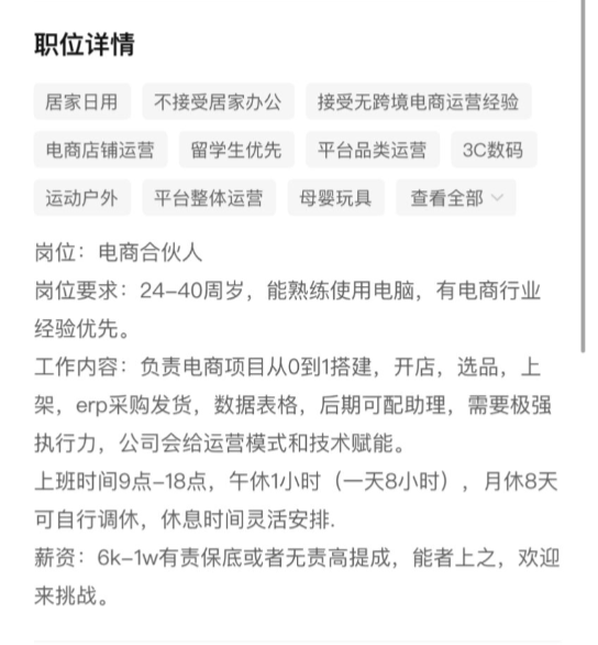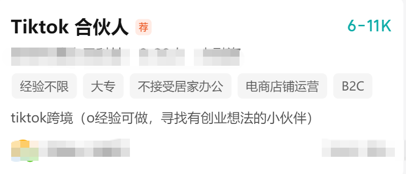 打开招聘平台,“TikTok跨境合伙人、跨境电商合伙人” 的岗位信息随处可见,“学历不限、接受小白、月入高薪” 的宣传语有着极强的吸引力。