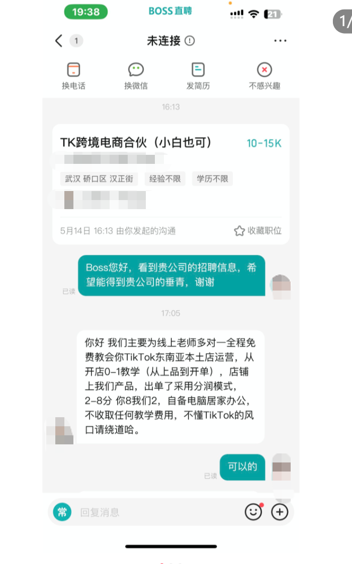 在社交媒体上,也有帖子分享其与武汉某跨境电商公司的沟通记录,该公司宣称能提供 “多对一免费教学,出单后 8:2 分润”。