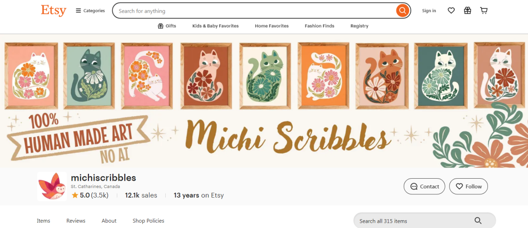 Michelle Nicole Simpson(也就是 Michi Scribbles)是一位生活在加拿大的自由插画艺术家,她在 Etsy 上经营店铺已有十多年,很擅长打造“Boho 小猫风格艺术”。作品包括猫咪、狐狸、狼和花卉等插画,风格贴近日常,有着温暖童趣,销量和好评都很高 。
