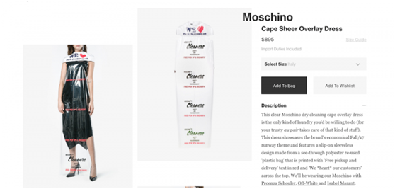 在今年2月份,意大利品牌Moschino(莫斯奇诺)在时尚T台上发布了一件外观类似“干洗袋”的连衣裙。
