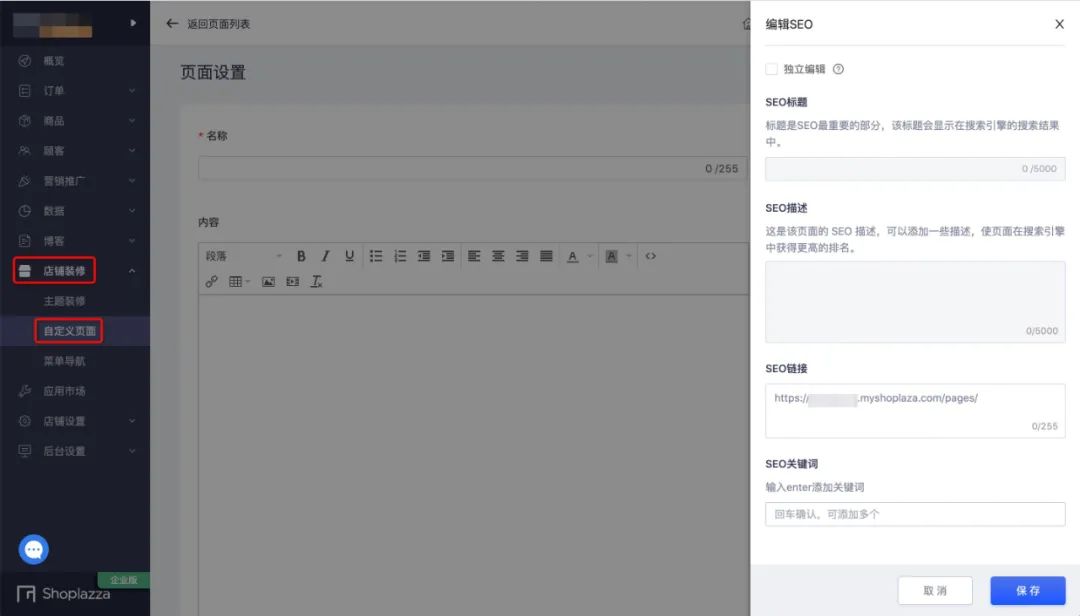 店铺后台 → 店铺装修 → 自定义页面 → 打开创建好的页面 → 编辑 SEO