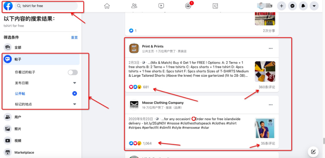 来,我们来实操一下,输入搜索内容(这里用“Tshirt”举例),选择“帖子”这一栏,选择“公开帖”,这时就会出现很多搜索结果。帖子的点赞和评论数越高,证明帖子的互动的人越多、热度越高,这样我们就能从中发现一些好的 Tshirt 产品。
