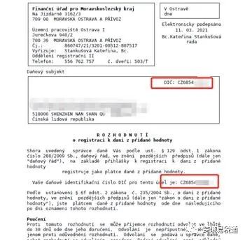 遵循捷克增值税法对发票的完整信息要求; 根据捷克供应时间规则为货物或服务开具发票的时间; 电子发票的使用,需获得客户的认可; 会计记录的维护,必须保留至少十年; 使用税局批准的外币汇率; 海外纳税者需要通过本地财税代表进行申报和税金担保。 税率 产品类型 21% 大部分产品 15% 食品(不包括基本的儿童营养和无麸质食品);不含酒精的饮料;带走食物;供水;残疾人医疗设备;儿童汽车座椅;部分国内客运;参加文化活动、表演和游乐园;作家和作曲家;公益住房;私人住宅的翻新和维修;清洁私人家庭;一些农业用品;酒店住宿;参加体育赛事;使用体育设施;社会服务;向殡仪馆和火葬服务机构提供物资;医疗和牙科保健;家庭护理服务;柴;一些药品;一些生活垃圾收集和街道清洁;废物和废水的处理;餐馆和咖啡馆提供的食物;切花和植物作装饰用途;作家、作曲家和食品生产 10% 食品(精选婴儿食品和无麸质食品);报刊;一些医药产品;一些书籍(包括电子书) 0% 欧盟内销售或其他出口销售 捷克VAT税号注册申请所需资料: 公司营业执照; 欧元银行账户(可以为国内的银行); 法人身份证明; 捷克授权书; 欧盟他国VAT证书; 签订税务代理合同。 捷克财政部网站: https://www.financnisprava.cz/en/index 欧盟VIES网站: https://ec.europa.eu/taxation_customs/vies/ 证书如下: 捷克为月度申报,一般要求在次月的25日前申报结束,并且缴足税金。 大家要注意,完整的捷克的申报报告,应该有三个回执:VARS, VATR, VATCS。 VARS - recapitulative statement - EC-sales 申报(FC transfer) VATR - 全部内容的总结申报 - 常规申报报告 VATCS - VAT control statement - Commingling sales and buy & FC-transction+ B2C+ Local B2B 捷克统计局对于Intrastate report监控很严格,销售超过12M就需要注册并且开始申报了,申报分为月报或者简易年报(12M-20M可以选择做简易年报) ,超过20M的则只能选择月度申报了,否则可能会面临50,000 CZK 的罚金。 付款账户信息 收款方名称:Finanční úřad pro Moravskoslezský kraj 收款方地址:Na Příkopě 28, 115 03, Praha 1 银行名称:Česká národní banka a.s. 收款方银行账户:705-77621761/0710 IBAN:CZ0207100007050077621761 银行BIC/SWIFT码:CNBACZPP 不变备注:每次备注号保持不变 可变备注:每次付款不同 捷克税务代表需要关注的2022.02.28新政 根据 § 69 et seq 建立的税务信息框。2020 年 12 月 31 日之前修订的税法第 280/2009 Coll. 号法案(以下称为“2020 年税法”)仅在 2022 年 2 月 28 日之前可用(参见第一部分,第二条,第. 1 第 283/2020 Coll. 号法案的过渡条款)。 根据立法,税务信息框 (DIS) 将在 MY Tax Portal 建立一年后取消,其中包括现代化的税务信息框加 (DIS +),它不仅具有独创的税务信息框,除此之外还有很多新的实用功能。“根据法律,必须终止对税务信息箱的访问。但最终,决定允许公众查看文件和个人税务账户中的选定数据的服务将维持一段时间,特别是由于税务顾问商会的要求。”首席财务官 Tatjana Richterová 表示。 查看数据选择服务将适用于根据 § 69 et seq 使用 DIS 的用户。修订至 2020 年 12 月 31 日的税法,以及与截至 2022 年 2 月 28 日的终止有关,他们将失去使用类似信息来源而无需付出努力的机会,这在目前的疫情形势,不允许新用户访问该服务。仅根据特别授权(即访问 DIS 的授权书)查看原始 DIS 的税务实体代表将不可能,因为其已于 2022 年 2 月 28 日依法终止(内容授予的授权将在本节中用尽),这些用户可以利用升级后的 DIS + 服务,对于根据无限制授权书查看 DIS 的税务实体代表,基于通过数据消息登录,可以连续访问该服务。 无法以任何方式激活查看数据服务或请求访问,将向这些用户提供网站 www.mojedane.cz 上的访问权限,这些访问方式与这些用户查看 DIS 的方式类似,即使用公认的电子签名,或以可以登录其身份的方式验证申请人的身份数据框。该服务将在 2022 年 3 月的第二周提供,最长过渡期为 9 个月。
