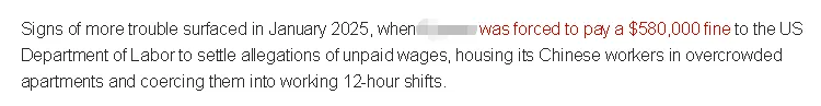 另外有点讽刺的是,同据《纽约邮报》披露,在2025年1月时,美国仓曾因违规问题被美国劳工部罚了58万美元,原因是因拖欠员工工资、让中国工人居住在过度拥挤的公寓中以及强迫他们轮班工作 12 小时。