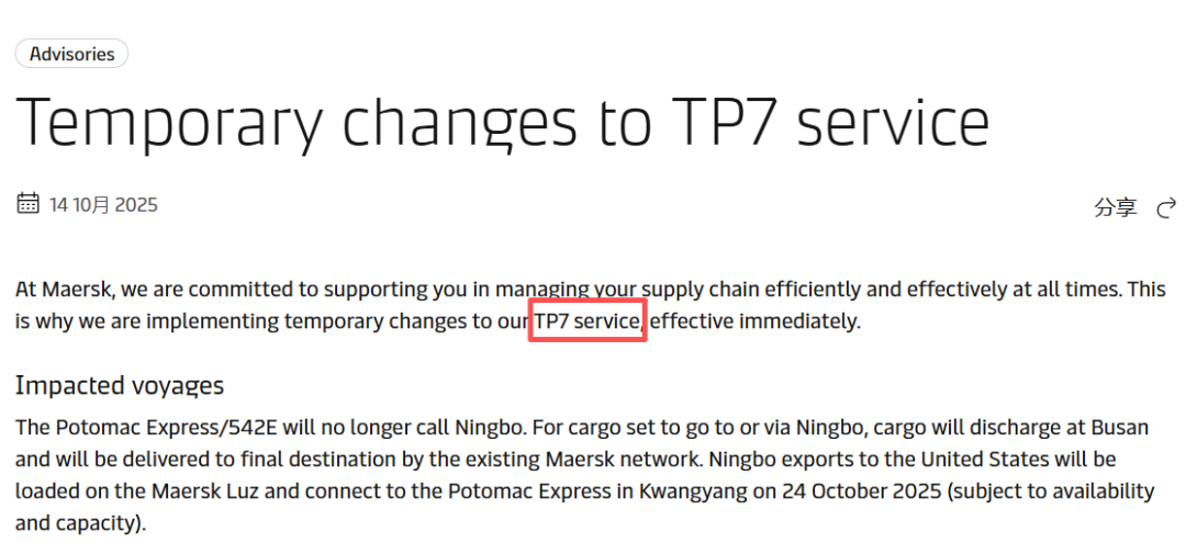 近日,马士基在官网发布公告称,马士基的TP7服务实施临时变更,立即生效。
