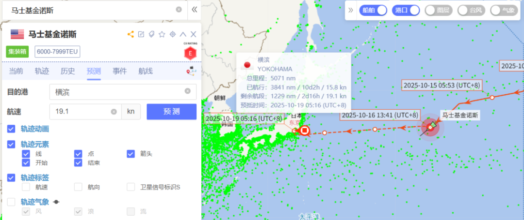 据搜航网战略合作伙伴中远海科旗下船视宝的船舶定位显示,目前“波托马克快线”船舶已靠泊釜山港。“马士基金洛斯”船目前正在驶往横滨,预计10月22日抵达釜山港。