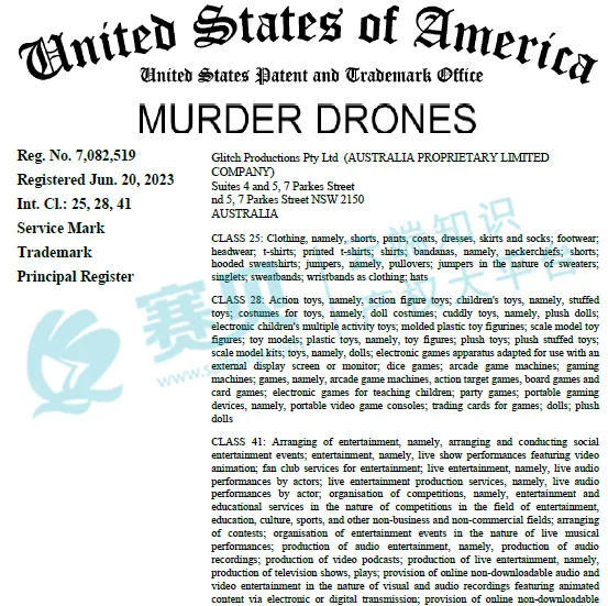 本次 Glitch Productions维权的是在美注册的两项核心 Murder Drones”商标,覆盖 14 类(仿珠宝、钟表、钥匙链等)、16 类(印刷海报、漫画书、文具、贴纸等)、 25 类(服装、鞋履、头饰等)、28 类(动作玩具、毛绒玩具、桌游等)、41 类(娱乐策划、动画制作、在线动画内容提供等)。两项商标均为标准字符商标,对字体、尺寸、颜色无限制,未经授权使用均可能构成侵权。