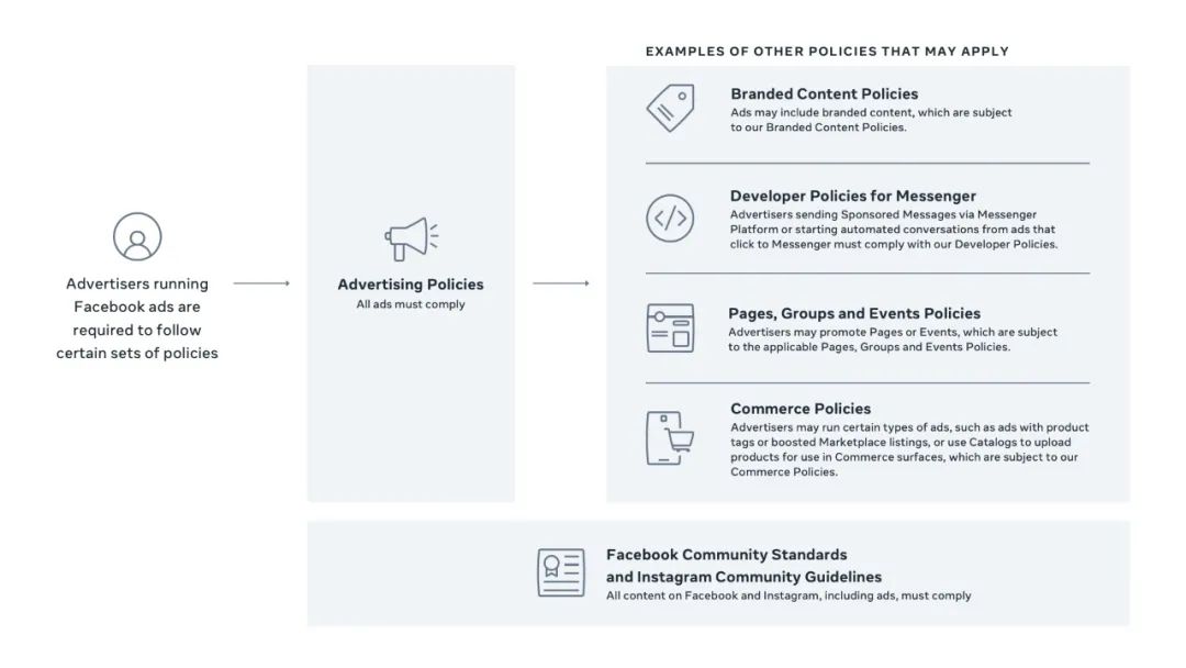 除了Facebook 的社区准则外,Facebook 还要求广告主遵守其广告政策。Facebook 的社区准则指导 Facebook 允许和不允许发布的内容,并适用于所有类型的内容,包括广告。Facebook 的广告政策对广告主提出了额外的要求,以此来进一步保护人们免受不良体验的影响——特别是因为广告可能会从他们不关注的主页或帐户的动态消息中发送给人们。例如,Facebook 一定不希望广告使用脏话、过度裸露或包含错误信息。当广告主在Facebook 的应用和服务中使用不同的产品时,也可能适用其他政策。例如,Instagram上投放广告也必须遵循其社区准则,这适用于Instagram上的所有内容。