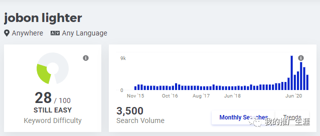 jobon lighter,我以这个关键词为例,最近几个月的搜索量飙升,最好的时候快1万的搜索量。