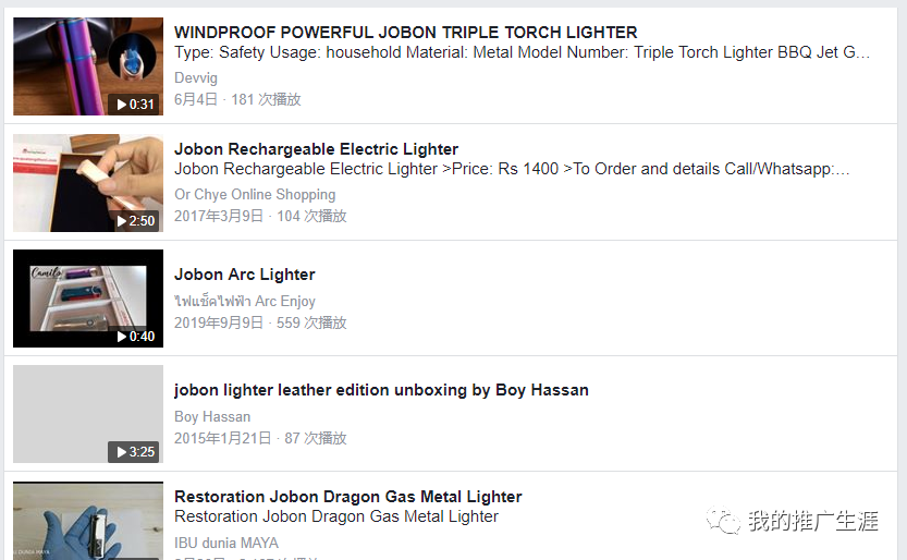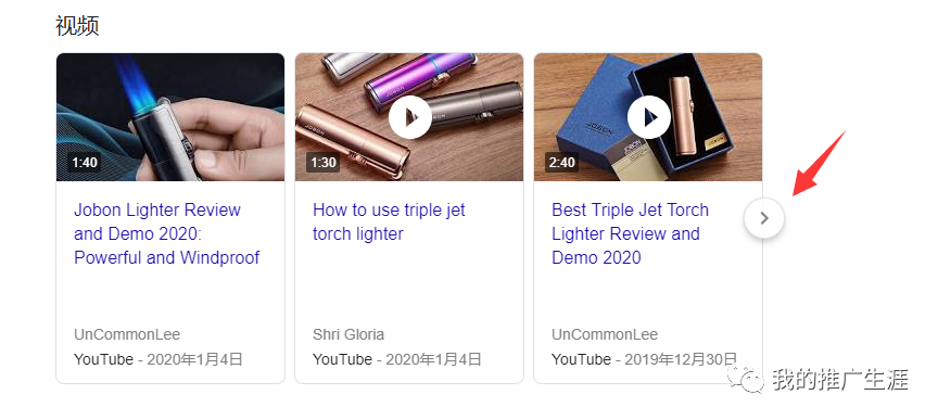 我们在谷歌搜素下“jobon lighter”,可以看到如下的结果:排名第一的是谷歌图片,排名第二的就是youtube视频,而且往往用户对视频的点击率会特别的高,转化也相应会高很多。