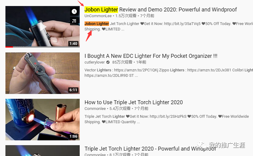 1,只有UncommonLee的视频在标题和描述都使用了关键词jobon lighter,而且关键词位置放在了最前面。