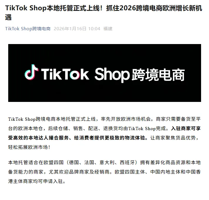 就在今天,TikTok Shop本地托管正式官宣。首站在欧盟四国(德国、法国、意大利、西班牙)上线。