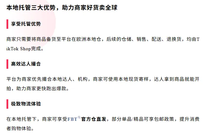 一句话概括,就是“备货至本地仓,平台全包后续服务” :商家把货送到欧洲的仓库,之后仓储、发货、处理退货这些麻烦事全由平台搞定,还能帮你对接当地达人、给补贴,不用自己操心运营。