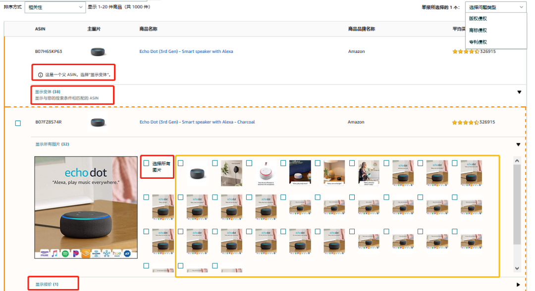 3 | 确定了一个或多个您认为侵犯了您知识产权的 ASIN、商品或图片后,请在搜索结果中点击相应项目旁的复选框。如果要选择 ASIN 的特定商品或图片,请点击商品名称下方的显示商品或显示所有图片 ![]() ▲点击图片查看大图 ![]() ▲点击图片查看大图 |