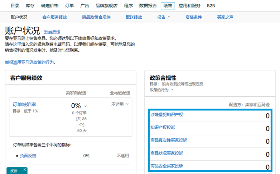 Step1 排查原因,注意阅读亚马逊绩效通知/邮件里的内容。登录卖家平台->绩效->账户状况,或复制👇以下链接到浏览器打开