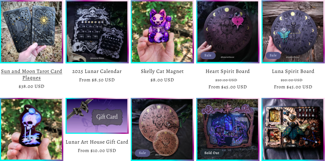 Candace Houchin是一位手工艺术家,她创办了Lunar Art House 品牌,专门制作独特的手工木制盒子、日记本和装饰品。她的作品灵感来源于大自然、神秘的元素,并加入“隐藏钥匙”的创意设计,每件作品从木材切割绘细节都由她亲手完成,既实用又充满艺术感,深受手工艺术爱好者喜爱。