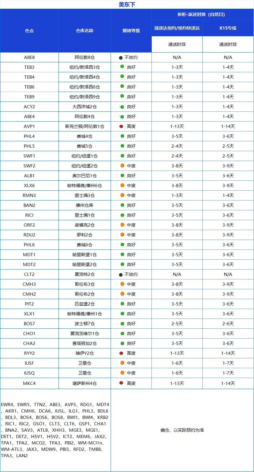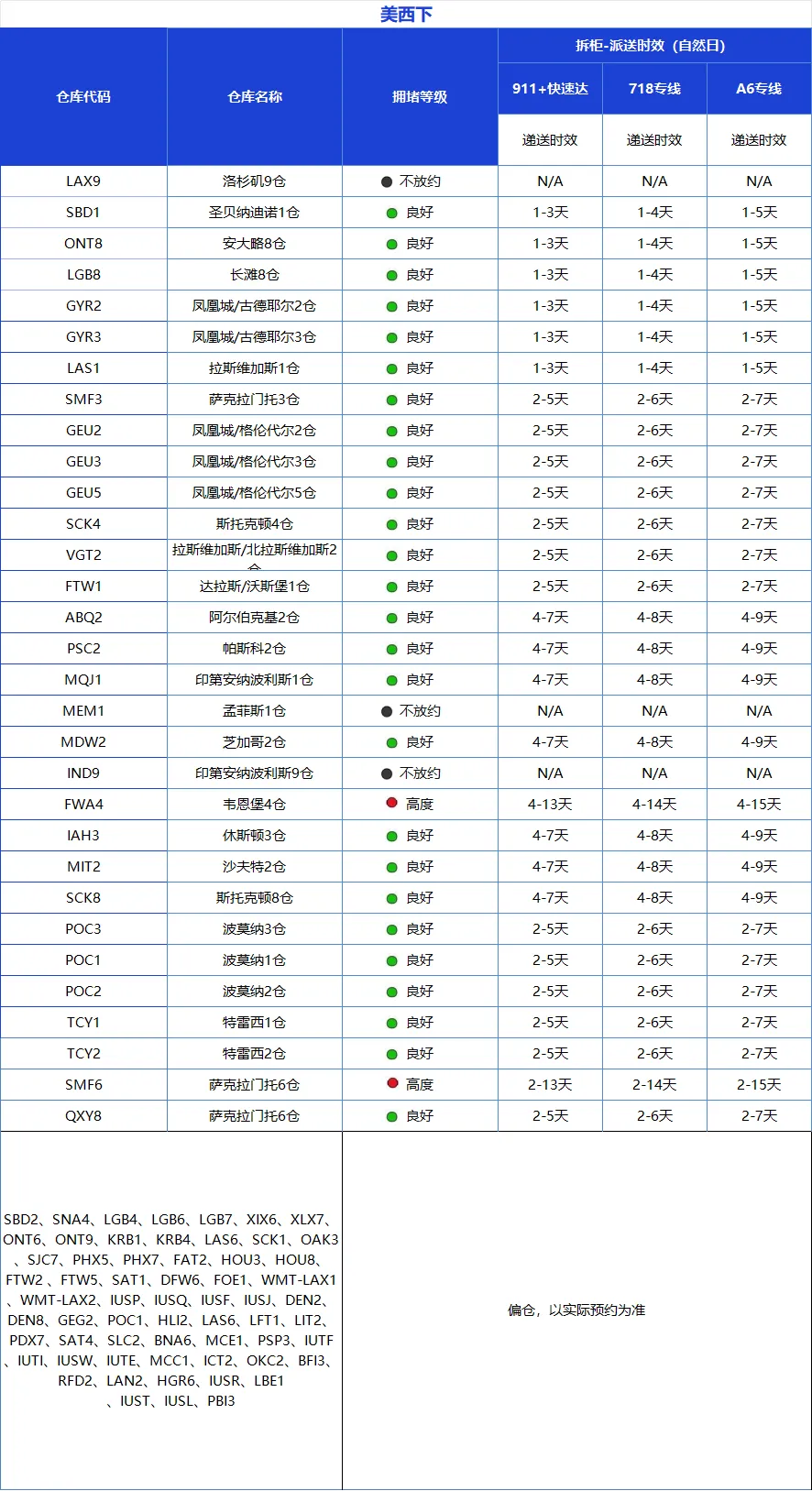 以下是当前美线的爆仓情况,以及我司各热门渠道针对各热门仓点的末端作业时效。