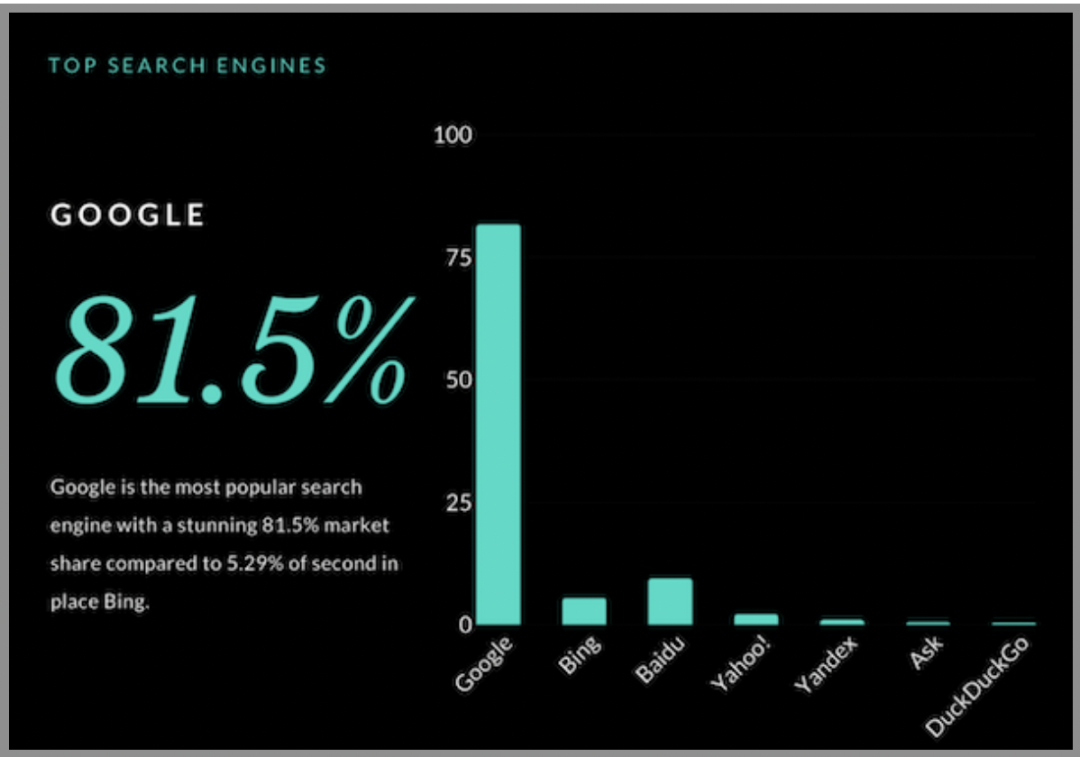 谷歌是全球最受欢迎的搜索引擎,在搜索引擎市场占据主导地位,其市场份额达到惊人的81.5%。它是迄今为止市场上使用最广泛的搜索引擎,秒杀了国际上其他的竞争对手。