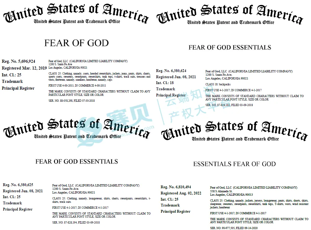 这次维权涉及到 4 项商标,大家可得逐个留意。其中 FEAR OF GOD 商标覆盖范围挺广,服装、鞋类、帽类都包含在内;FEAR OF GOD ESSENTIALS 有两项商标,一项是针对背包的,另一项是针对服装的;还有 ESSENTIALS FEAR OF GOD 商标,主要涉及服装和帽类。赛贝在这儿得郑重提醒各位跨境卖家,这几项商标,没得到授权可千万别随便用,不然很容易就踩中侵权的雷区。