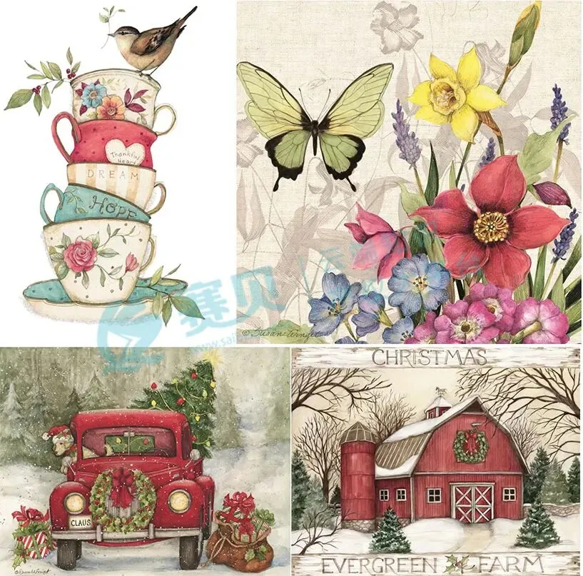 案件涉及 Susan Winget 的4 项艺术作品,VA2-433-832、VA2-423-745、VA2-423-064、VA2-423-062,涵盖圣诞主题(像红色卡车带圣诞树、农场雪景这类)、花卉主题(多彩花卉与蝴蝶)、茶主题(堆叠茶杯与小鸟)等,走的是美式乡村风,还带着温馨治愈的感觉。赛贝可得提醒跨境卖家,没经过授权可别随便用,不然容易引发侵权风险。
