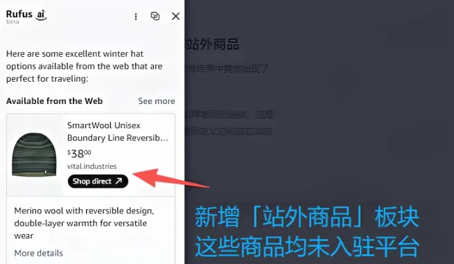 重磅调整,最近如果你在 Amazon App 里用过Rufus,你会发现在Rufus的推荐结果中,新增了一个独立的「站外商品」板块。