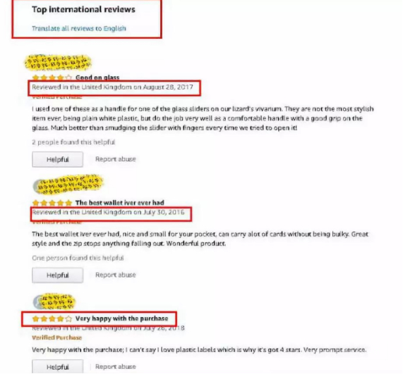 亚马逊增加了合并各站点Review 的功能,合并过的review会在加粗字体“Top international reviews” 下方集中展示,并且还可以点击翻译成当前站点的语言;每条review都会在星级下方显示评论的站点和时间,如下图展示的“Reviewed in the United Kingdom"