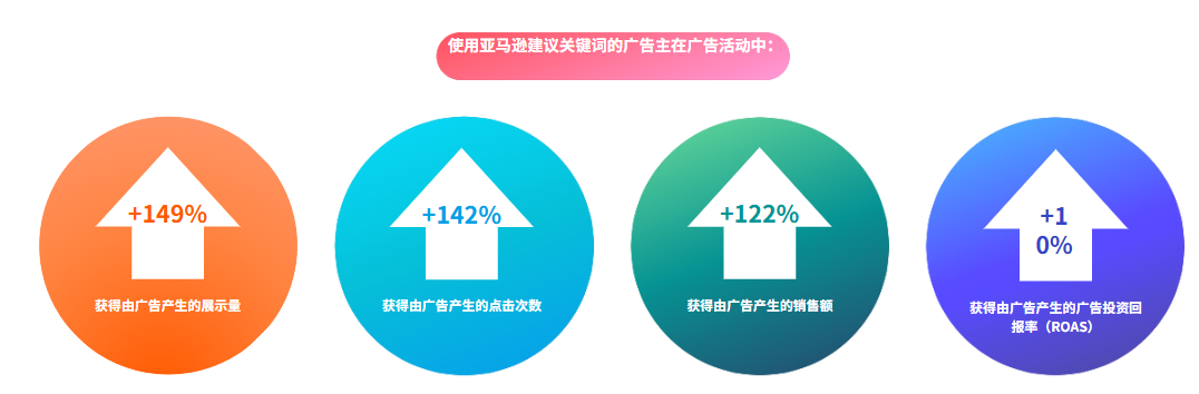 亚马逊广告投放关键词主要来源于系统建议的关键词、ASIN标题 / Top Listings、亚马逊网页搜索框、搜索词(展示量份额)报告和品牌分析报告中。平均而言,广告主自己的研究添加的关键词相比,使用亚马逊建议关键词的广告主在广告活动中获得由广告产生的展示量、点击次数和销售额分别高出了149%、142%和122%,广告投资回报率(ROAS)也高出了 10%。——数据背后是关键词投放的科学方法论。