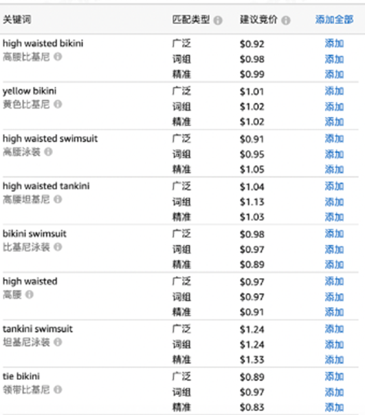 直接采用推荐词(高腰比基尼/黄色比基尼)并开启自动广告,CTR提升可达40%。