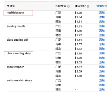 当系统推荐词如上图所示,广告投放的产品是止鼾带,产品排名较前的关键词标签是health beauty 、chin slimming strap (美容、瘦脸带)等与anti snoring chin strap 相关度不大的关键词上。