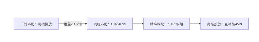 预算配比:40%(广泛)→ 30%(词组)→ 20%(精准)→ 10%(商品)