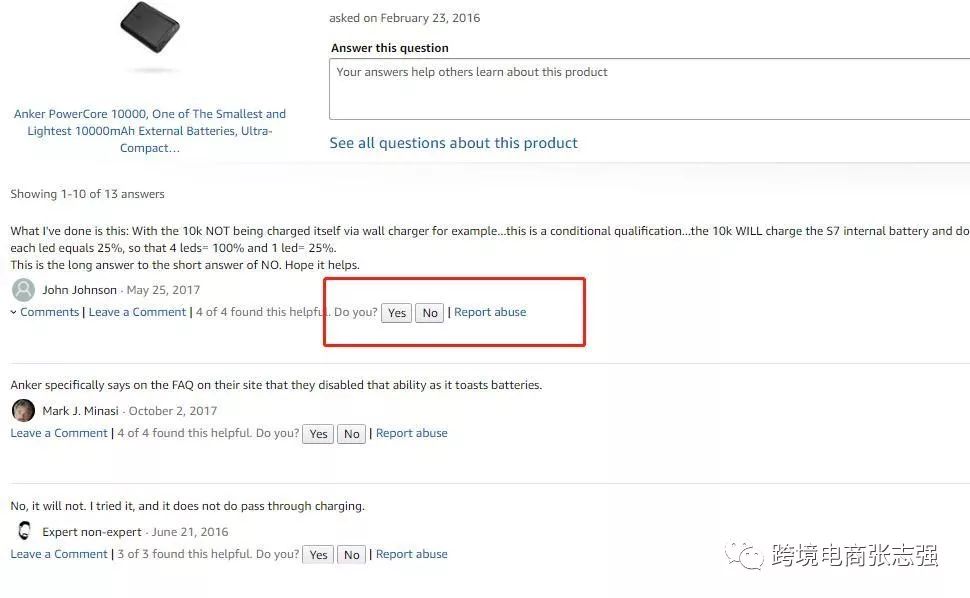 遇到负面回答怎么办 :遇到负面的回复,卖家可以通过点“No”的方法把回复踩下去,如果客户的提问或是回答与产品无关并且是不公正负面的,可以尝试点击“Report abuse”进行投诉,让亚马逊处理。