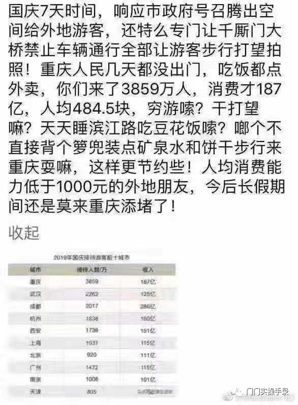 网上有人拿重庆话调侃,国庆期间接待游客最多的城市,竟然人均消费不到500元!