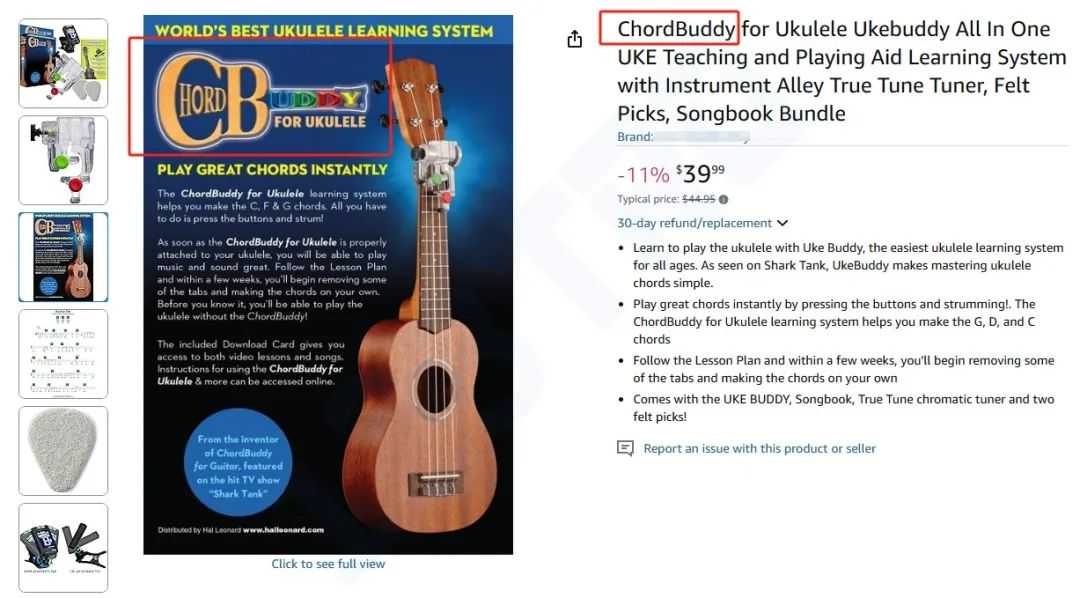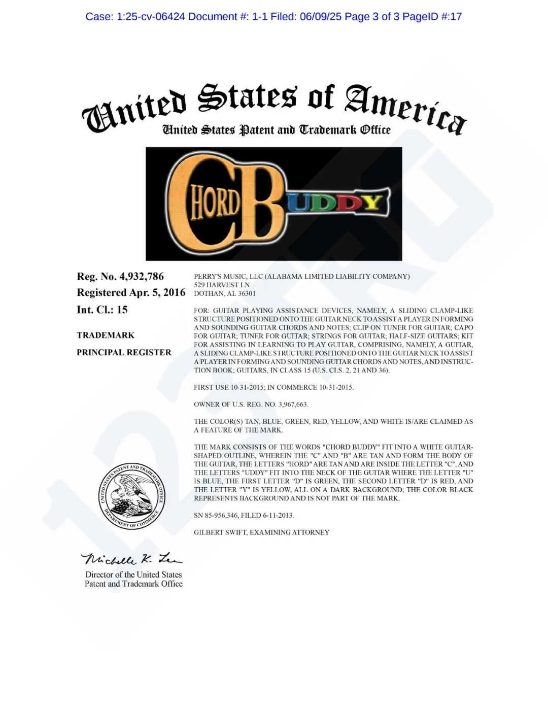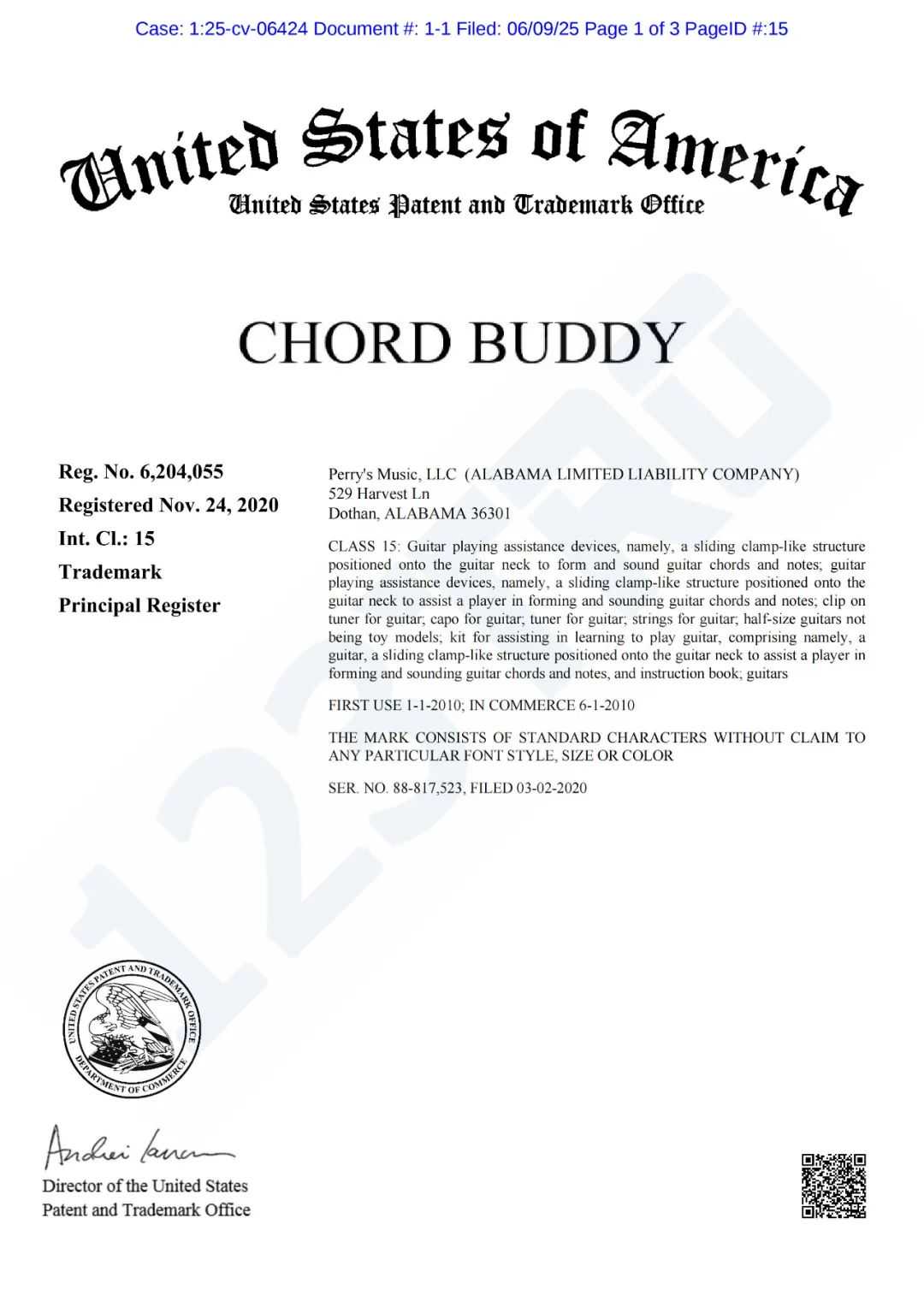 原告Perry's Music LLC主要为音乐家提供乐器配件和书籍,CHORD BUDDY就是提供给吉他爱好者弹奏和弦的设备。