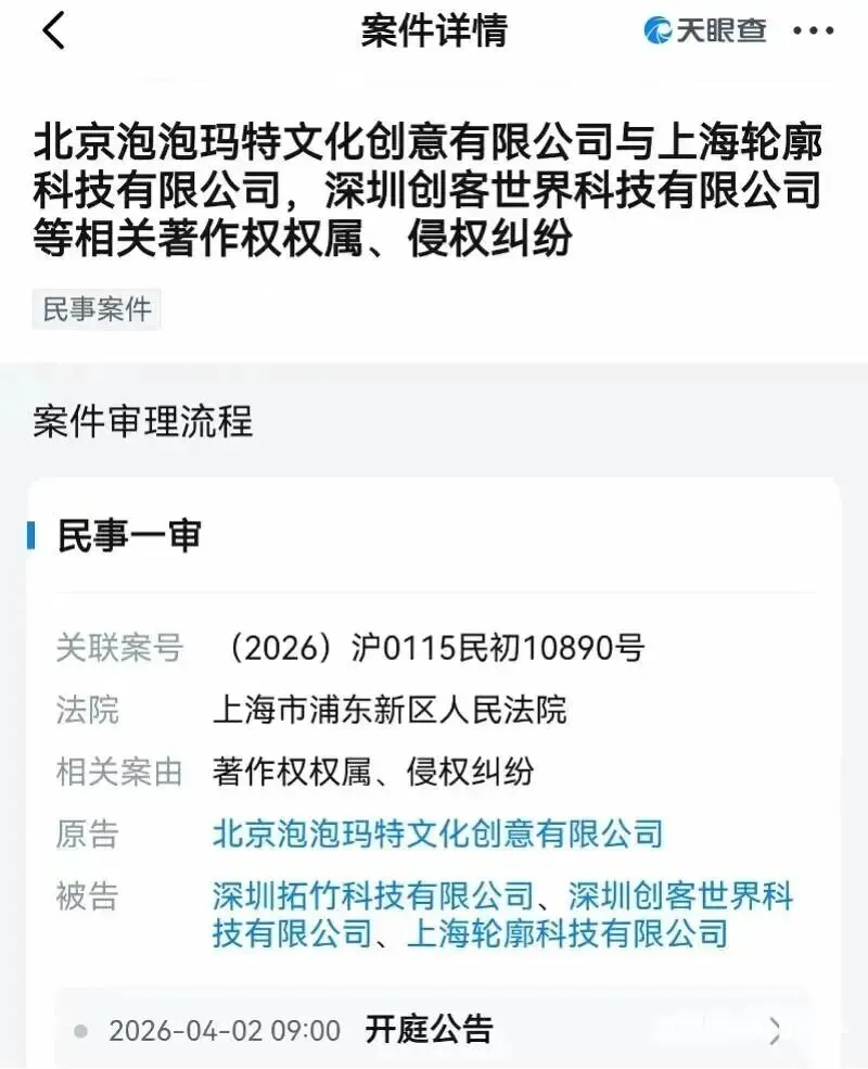 2月底,两起版权诉讼接连落地,将拓竹科技推上舆论风口。泡泡玛特以著作权权属、侵权纠纷为由起诉拓竹,案件定于4月2日开庭;同期,《罗小黑战记》出品方寒木春华,以侵害作品信息网络传播权为由提起诉讼,开庭时间为3月20日。