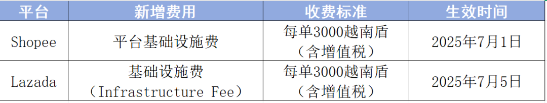 近期,Shopee越南站点宣布,自2025年7月1日起将新增平台基础设施费用(含增值税),针对跨境直邮店铺、三方仓店铺和南宁仓店铺按照每单3000越南盾的标准收费。随后,Lazada也同步跟进,自2025年7月5日起,Lazada越南站点将对LazMall跨境商家增设"基础设施费(Infrastructure Fee)"收费项目。
