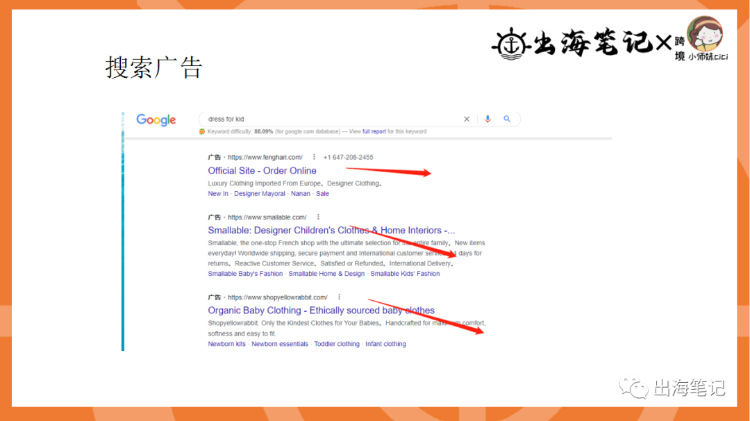 例如dress for kid这个儿童裙子,那我们首先会看到在网页的顶部就会有写着广告,这些其实就是搜索广告。