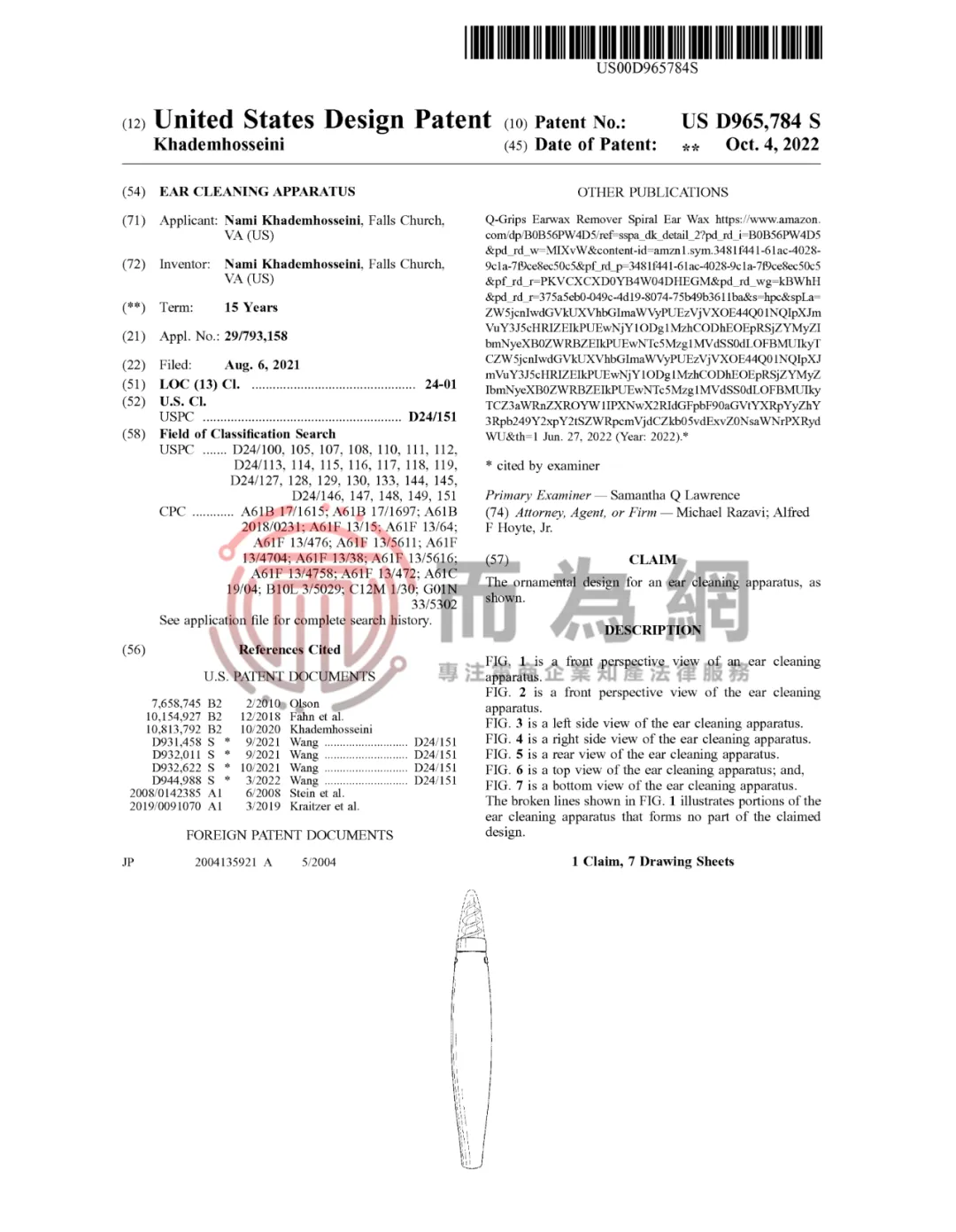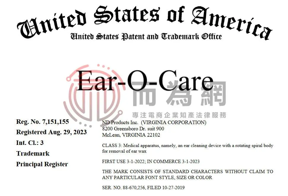 本案涉及的商标信息如下,主要注册在第3类医疗设备,即一种带有旋转螺旋体的耳部清洁装置,用于清除耳垢。未经授权不能擅自使用,否则会有侵权风险!