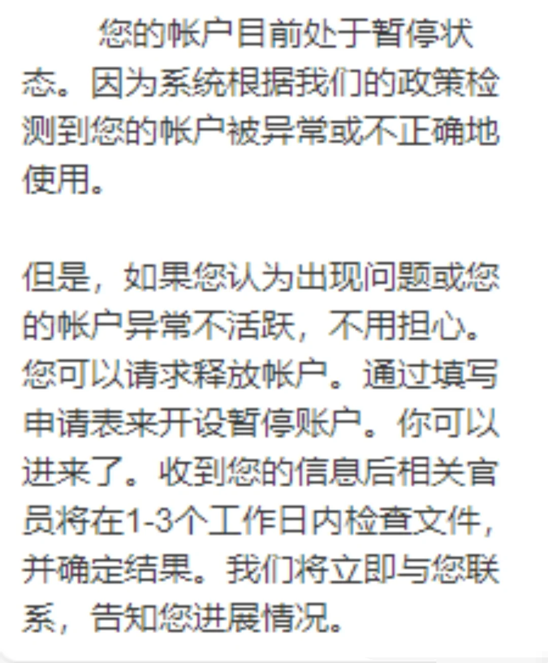 卖家 C:“收到一封邮件,提示账户因异常或不正确使用被暂停,但可通过填写申请表申请释放账户,相关工作人员会在 1 - 3 个工作日内检查文件并告知结果。”