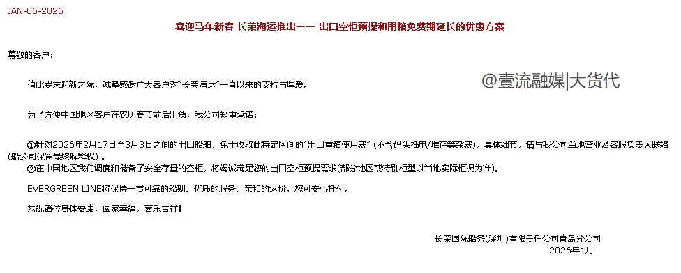 随着2026马年春节临近,近日,长荣、ONE两家船司也是率先发布了《关于2026年春节期间出口免用箱通知》。